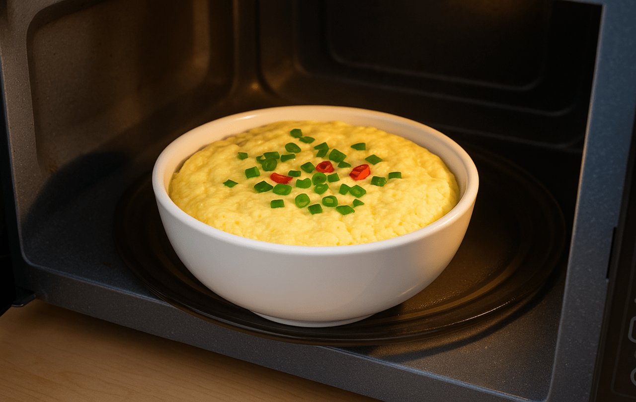 계란물이 준비되면 뚜껑이 있는 내열 용기에 담아 전자레인지에 넣는다. 처음에는 약 2~3분 정도 가열한 뒤 꺼내어 잘 저어주고, 다시 2~3분 정도 더 돌리면 완성된다. 이 과정에서 중간에 한번 저어주는 이유는 표면과 안쪽이 고르게 익도록 하기 위함이다.
