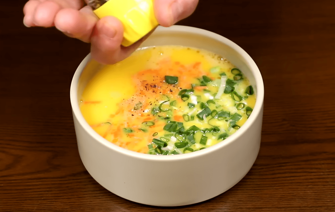 전자레인지 계란찜을 만들기 위해서는 계란 세 개와 물 또는 다시마나 멸치육수 150ml, 소금 약간만 있으면 된다. 여기에 참기름, 다진 파, 간장 등을 곁들이면 풍미가 더욱 살아난다.