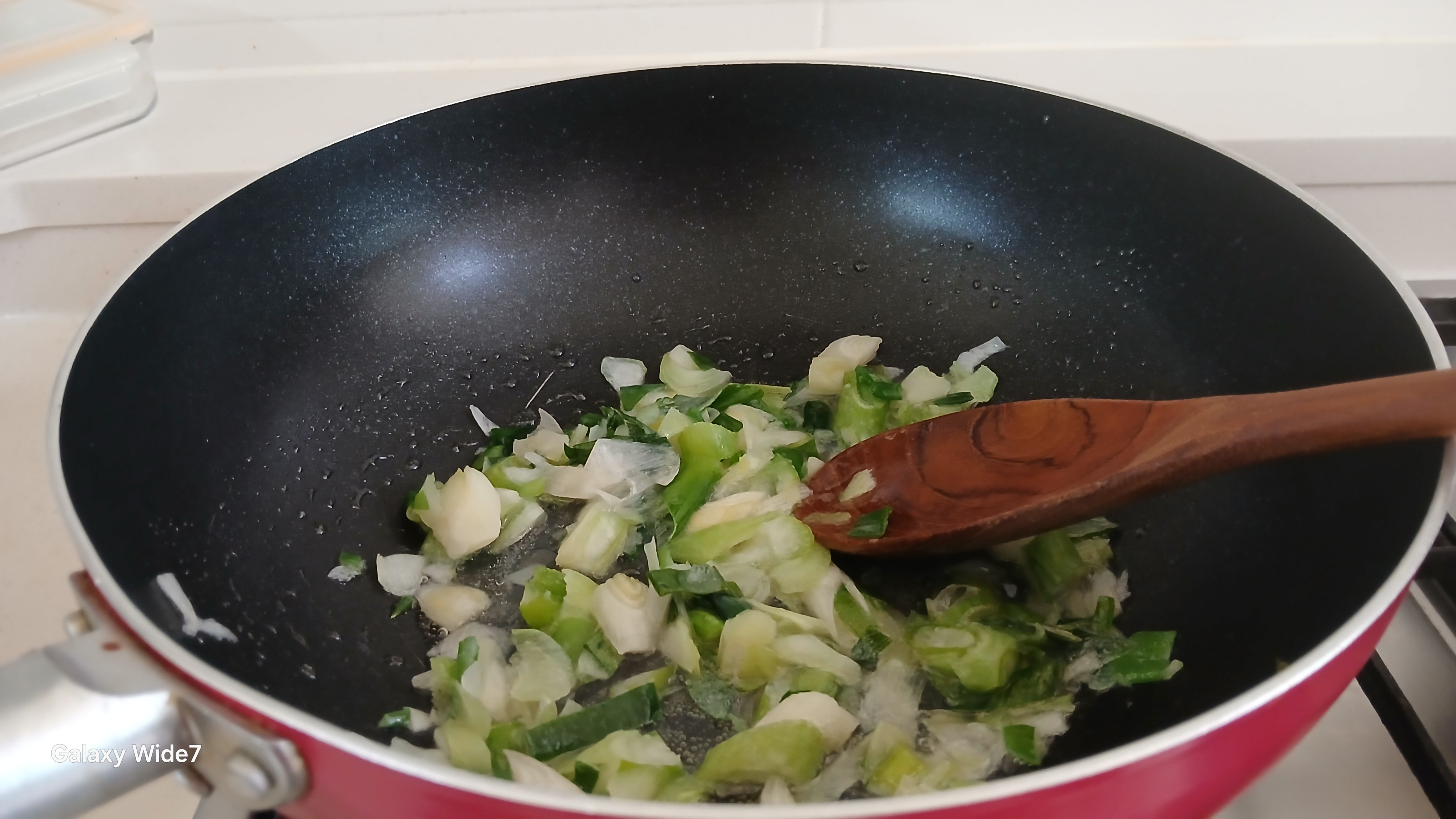 ▲팬에 기름 두르고 대파 짤게 썰어 넣어 주시고